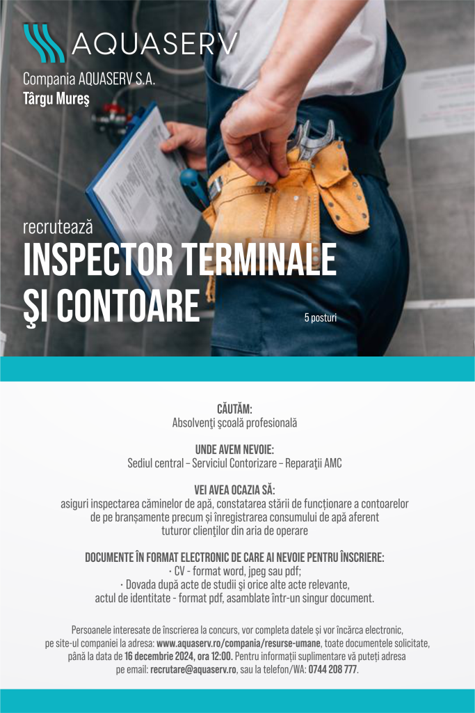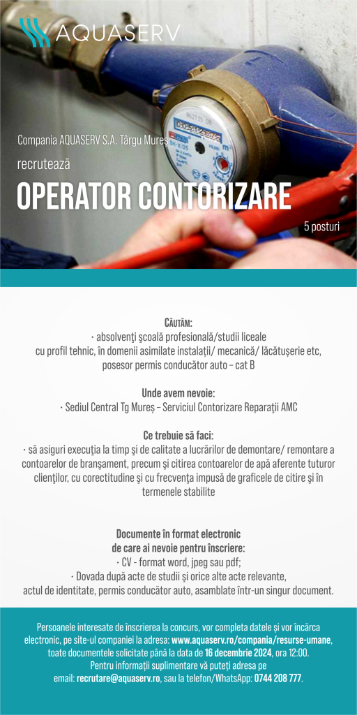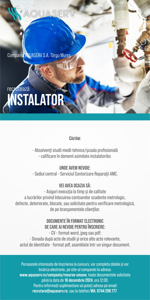 Compania Aquaserv S.A. Tg. Mureș recrutează