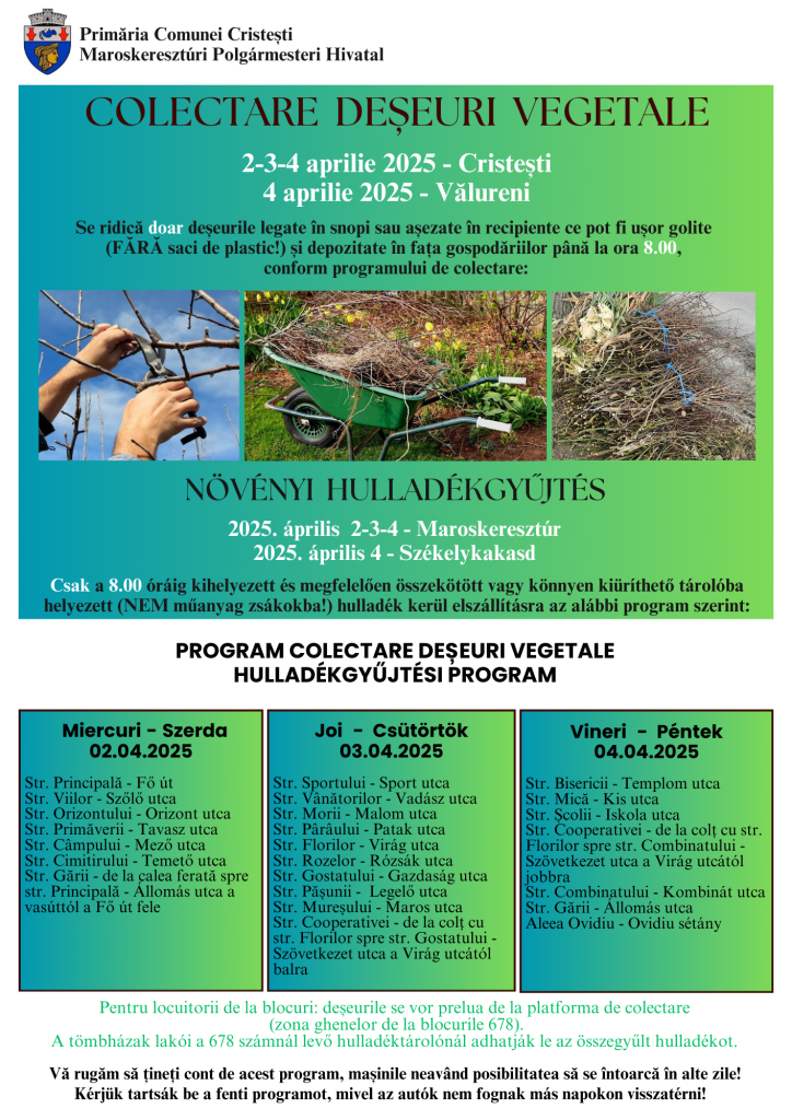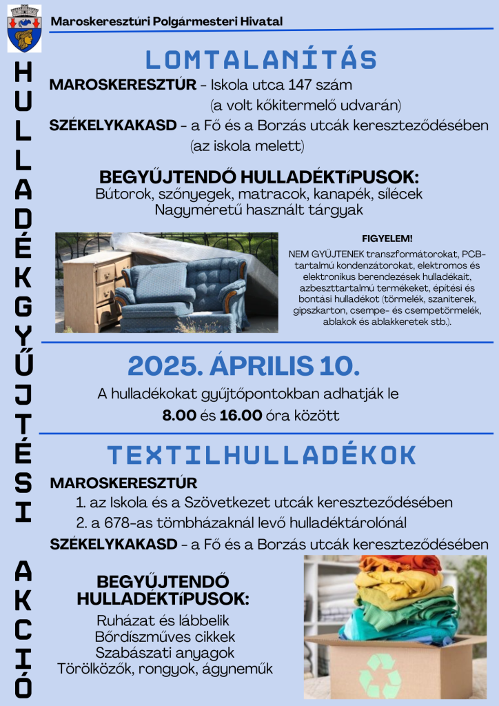 Tavaszi hulladékgyűjtési akció: április 2-3-4 NÖVÉNYI HULLADÉK, április 10 LOMTALANÍTÁS és TEXTILHULLADÉK